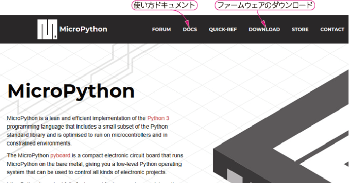 | 図1 マイコンと対話しながら開発を進められる翻訳ファームウェア MicroPythonのホームページからは,さまざまなマイコン用のファームウェアや使い方のドキュメントを入手できる |