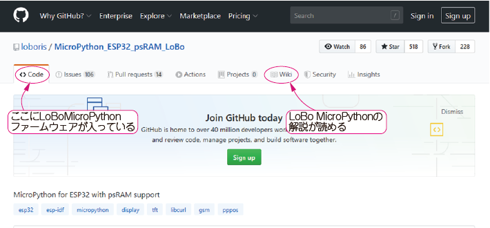 | 図3 M5Stackに搭載されているESP32マイコン用MicroPythonファームウェア LoBo MicroPythonをGit-Hubから入手する |