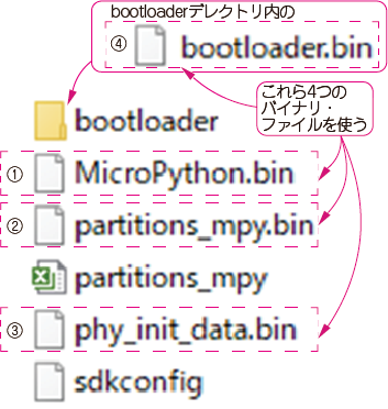 ビルド済み実行ファイルは,“MicroPython_BUILD”フォルダ内にあります.フォルダにはビルド条件の異なるファームウェアが複数格納されています.今回は“esp32_all”を使います.複数のファイルが1つにまとめられた“MicroPython_LoBo_esp32_all.zip”をダウンロードして展開(解凍)すると,図4に示す4つのバイナリ・ファイルが得られます.
