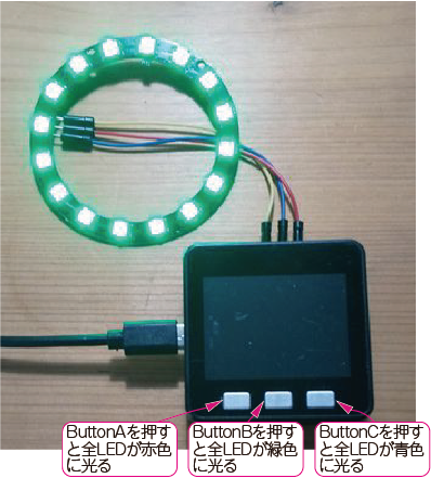 M5Stackが備えるAのボタンを押したら全LEDが赤色に,Bのボタンを押したら全LEDが緑色に,Cのボタンを押したら全LEDが青色に点灯するプログラムを作ってみましょう.