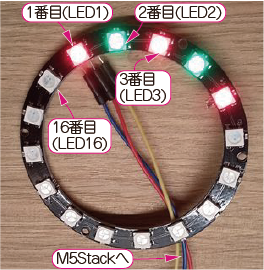 図37に,M5StackとNeoPixelに搭載されている16個のカラーLED “WS2812B”との接続を示します.