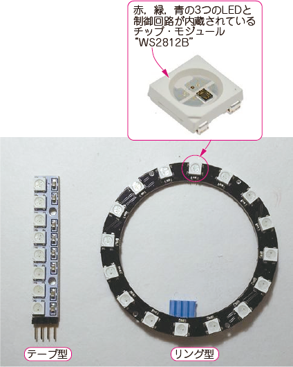写真6に示すのは,複数のフルカラーLEDを実装した電飾モジュール「NeoPixel」です.1個のフルカラーLEDチップ(WS2812B,Worldsemi製)は,赤色,緑色,青色の3個のLED素子と,シリアル・データ通信とLEDの点灯を制御する回路が一体になっています.このチップを複数個搭載したテープ状,リング状,パネル状のものが製品化されています.