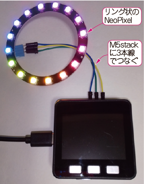 図37に示したように,3本の配線を使ってM5StackとNeoPixcelを次のように接続します.写真7に外観を示します.
