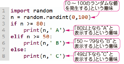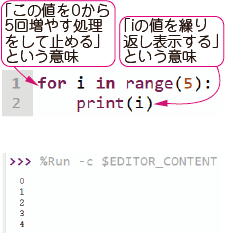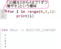 5行目以降は,変数iの値をrange関数で1~16まで変化させるfor文です.6~9行目のインデントされた部分がfor文が有効な範囲です.