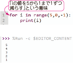 図43に示します.“for i in range(16,0,-1):”と記述します.図41のソースコードとほぼ同じですが,5行目のfor文のrange関数の引数が違います.