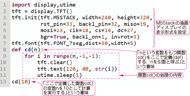 8行目は,カウントダウン関数“cd(n)”です.括弧の中のnは,関数内で演算に使用するために引き渡す値です.引数はいくつでもOKです.今回はcだけです.その処理の内容は,続く9~12行目にfor文を使って,引数で引き渡されたnから1ずつ減らす,というふうに記述しています.