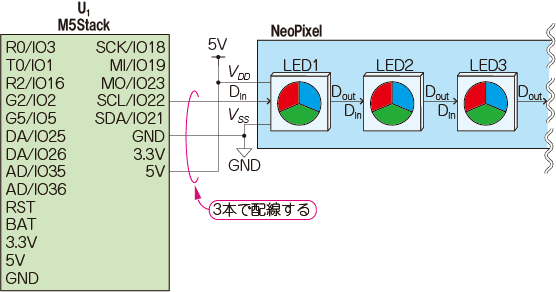 - NeoPixelのDin端子とM5StackのGPIO端子(22番ピン)