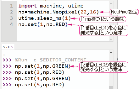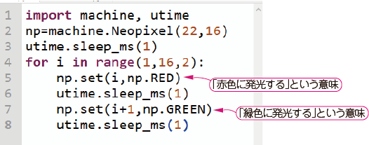 3行目の“utime.sleep_ms(1)”は「1ms間プログラムを静止せよ」という命令です.16個の全LEDチップに制御信号を送られるまでに数百μsかかるため,NeoPixelに命令を送った後,1ms程度の待ち時間を設けます.