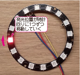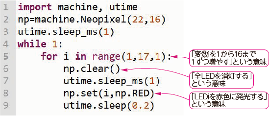 range関数の引数をstart= 16, stop= 0, step= -1 に設定すると,for文の変数iが“16,15,…2,1”というふうに-1ずつ減り,LEDの発光位置が反時計方向に回ります.