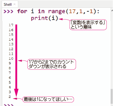 図42のように“for i in range(17,1,-1):”とシェルに記述してリターンを押してください.インデントが自動的に挿入されるので,print(i)命令を記述して,変数iをシェルに表示して確認します.インデントが挿入される制御文の処理範囲を確定させると,勝手にfor文が起動して変数iが表示されます.