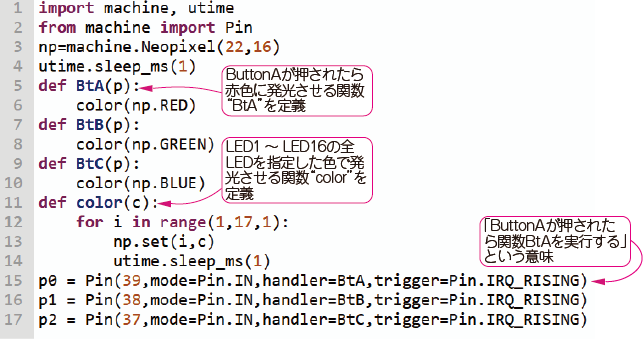 GPIOピンの2つの引数“handler”と“trigger”を使って初期設定すると,ボタンが押されたことをマイコンが検知するようになります.“handler”は,割り込みが発生したときに呼び出す関数(BtA)です.“trigger”は,トリガをかける条件を設定する引数です.“trigger=Pin.IRQ_RISING”と記述すると,信号が立ち上がったとき,つまりボタンから指が離されたときにトリガをかける,というふうに動作します.“handler”は,トリガ検出後に起動する関数を指定しており,A,B,Cの各ボタンごとに変えています.