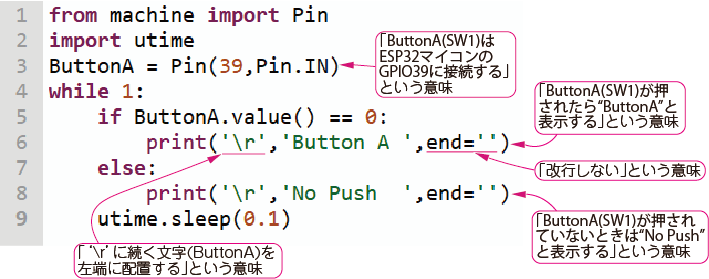 2行目の“from…”の箇所で,machineモジュールのPinメソッドをインポートします.