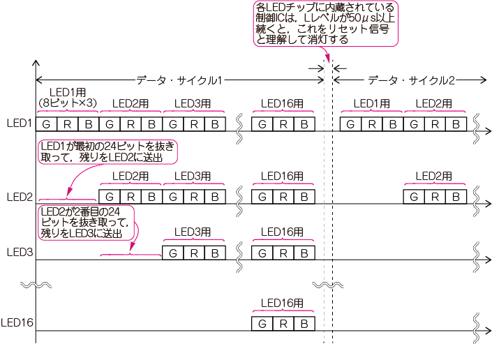 図38に示すのは,16個の各LEDチップに配信される制御データのタイミングです.