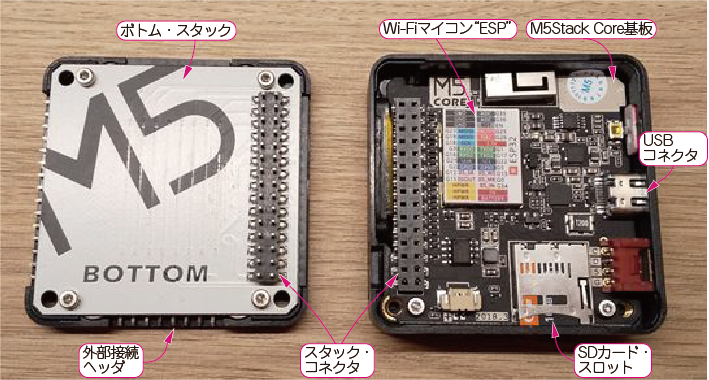 ケースを開けると,Wi-Fi通信が可能な安価な高性能マイコン“ESPシリーズ(Espressif Systems製)”やSDカード・スロット,USBコネクタを搭載したCoreと呼ばれる基板が出てきます(写真2).
