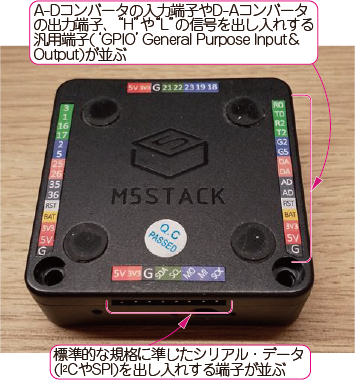 写真1に示すのは,対話型開発が可能な最新のマイコン・キット M5Stackです.液晶ディスプレイとボタンを備えていて,通販で3,500円ほどで入手できます.