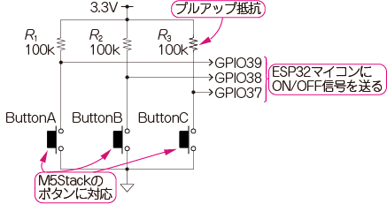 15~17行目は,A,B,Cの各ボタンのON/OFF状態をマイコンのGPIO端子に伝えて,ボタンが押されたら,プログラムの処理に割り入って指定の関数を処理するように設定しています.ハードウェア端子でソフトウェア処理の流れに割り入ることを「外部割り込み」と呼びます.この方法を利用することで各ボタンの端子を常時監視する必要がなくなります.