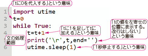 4行目で,“while 1:”と記述して,whileの制御文を常に1(True)に設定しています.これで,いったん走り出したら止まらなくなります.