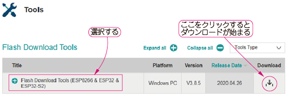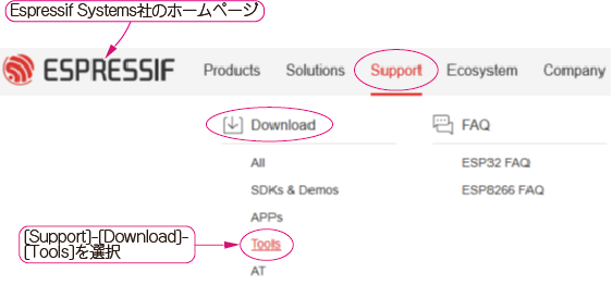 | Espressif Systems社のホームページから[Support]-[Download]-[Tools]を選ぶと,“Flash Download Tools”をダウンロードするページが開く. |
