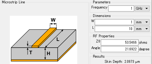 ここまで,パターン幅$W=$1mmで話を進めてきましたが,曲げ以外の反射の影響をなくすため,伝送線路計算ツールで特性インピーダンス50$\Omega$のパターン幅を求め,マイクロストリップ線路部品に適用しています.