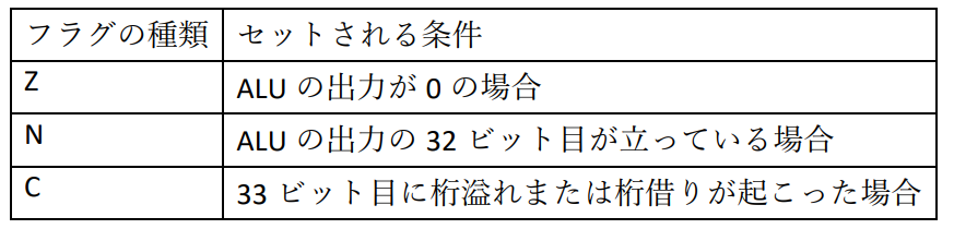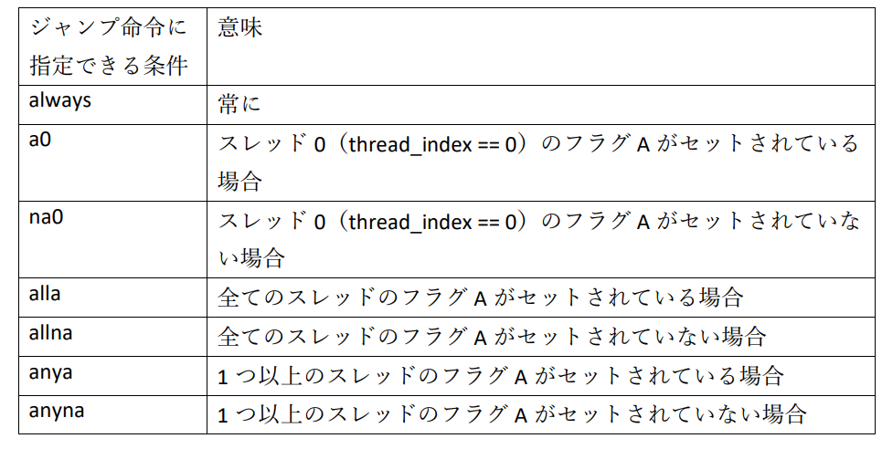 フラグはスレッドごとにAとBの2つあり,表に示す条件でセットできます.フラグは基本的にAに格納されますが,add ALUとmul ALUの両方でフラグをセットしようとした場合は,mul ALUのほうの結果はBに格納されます.例えば,加算の結果をもとにフラグAにZフラグ,フラグBにNフラグを立てたい場合はadd(a, b, c, cond=’pushz’).add(a, b, c, cond=’pushn’)とします.