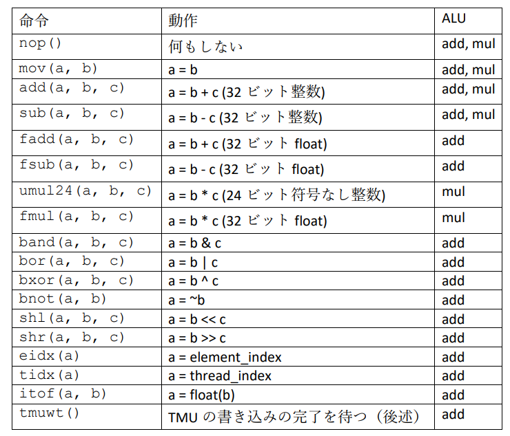 QPUには32ビットのALU(計算ユニット)が2つ(add, mul)あります.2つのALUは1命令で同時に動作しますが,実行できる命令が一部異なるので注意が必要です.それぞれのALUで実行できる命令の一部を図7に示します.