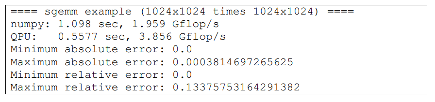 インストールできたら python3 examples/sgemm.py と実行してエラーが出ないか確認してください.このプログラムはQPUで行列の乗算を計算します.正しく実行できたら図6のように表示されます.