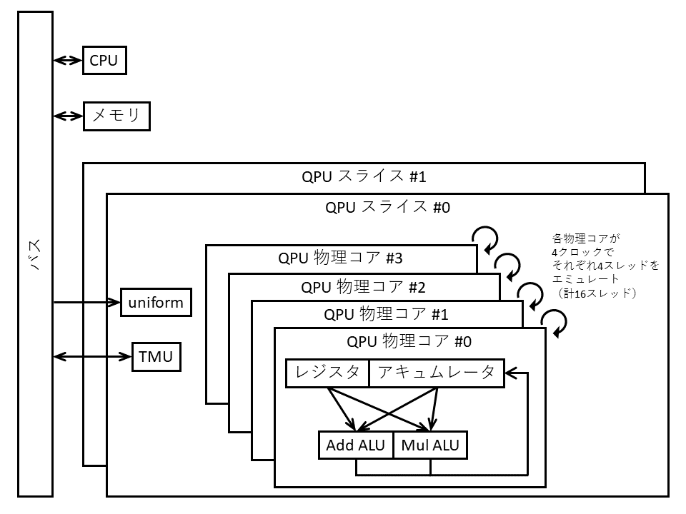 1つのQPUは,4つの物理コアをもち,1つの物理コアには32ビットのALU(計算ユニット)が2つあります.