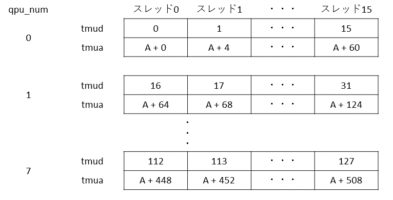 QPUには,TMU(Texture Memory Unit)という,メモリの読み込みと書き込みのためのユニットがあります.