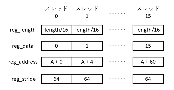 次に,16スレッドで実行することを考えると,次のコードになります.element_indexはスレッドごとの番号(0, 1, …, 15)を表すとします.