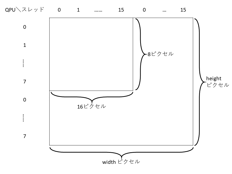QPUとそのスレッドが担当するピクセルの分割は,図16のようにします.つまり,横方向をスレッドの数で,縦方向をQPUの数で分割するようにします.このため,width は16の倍数,heightは使用するQPUの数の倍数とする必要があります.