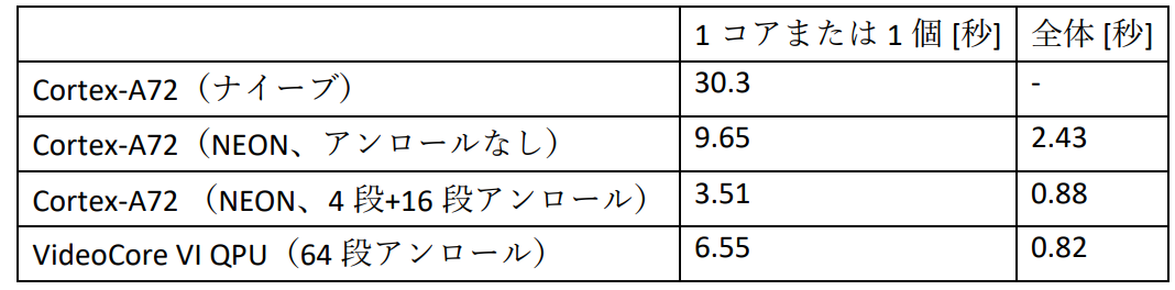 さらに,NEON実装にループ・アンローリングを施すと,2.75倍の性能が得られました.NEON命令は通常の命令と比較してレイテンシが大きいことがほとんどなので,収束のチェックをまとめて行うことで,かなりの性能向上を得ることができました.