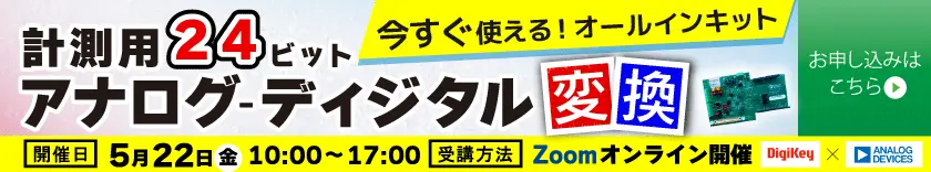 | [Webinar]今すぐ使える!計測用24bitアナログ-ディジタル変換オールインキット 5月22日開催:$\Sigma \Delta$型A-Dコンバータとセンサで,マイクロボルトを高解像度サンプリング&データ解析 |
