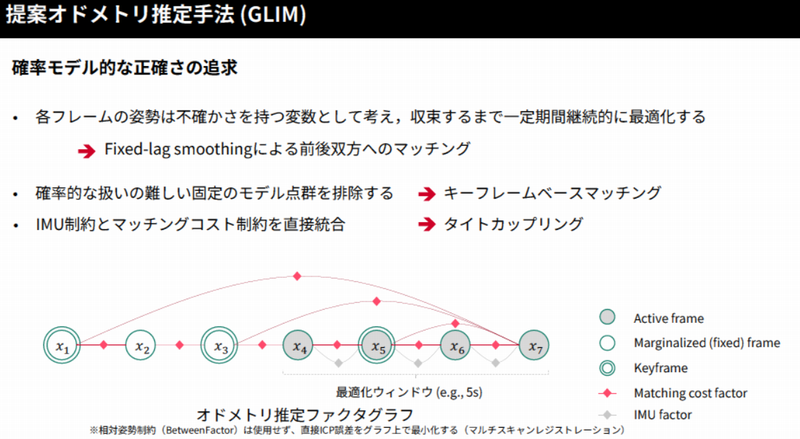 GLIMアルゴリズムでは,各フレームの姿勢を不確かさをもつ変数として扱い,収束するまで一定期間継続的に最適化します.従来の手法では1フレームずつ姿勢を確定していましたが,GLIMでは過去5秒間の全フレームを同時に最適化するFixed-lag smoothingを採用しています.