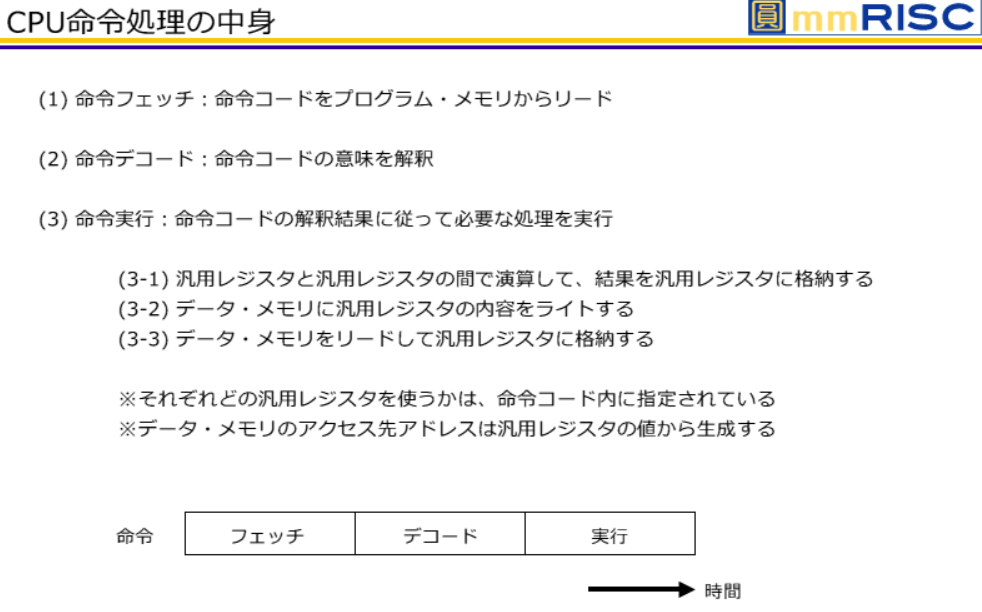 CPUが命令を処理する際,基本的には3つのステップで行われます.最初のステップは命令フェッチです.命令コードをプログラム・メモリから読み出し,CPU内に取り込みます.次に命令デコードのステップで,フェッチした命令コードの意味を解釈し,どの汎用レジスタやメモリ・アドレスを使用するかを決定します.最後に命令実行で,解釈結果にしたがって演算やメモリ・アクセスが行われます.