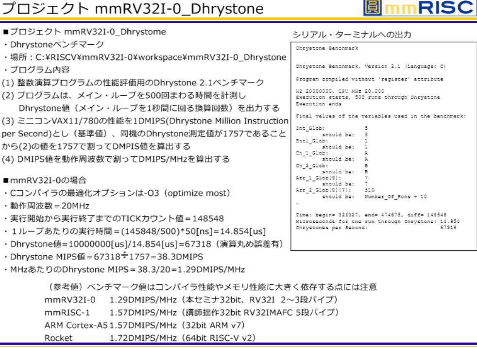 今回のミニRISCマイコンでは,1秒あたりのDhrystoneループ回数は67318で,DMIPS値は38.3DMIPSです.これを動作周波数20MHzで割ると,1.29DMIPS/MHzになります.比較として,講師作成のRV32IMAFC 5段パイプCPUでは1.57DMIPS/MHz,ARM Cortex-A5では1.57DMIPS/MHz,64bit RISC-V Rocketコアでは1.72DMIPS/MHzです.