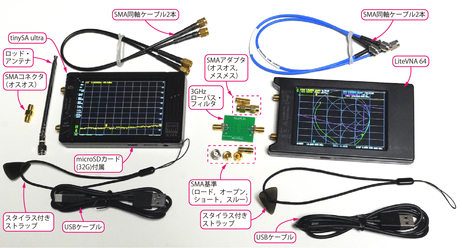 2. 上記1に付属の50ΩSMA同軸ケーブル,USB Type-Cケーブル,SMAショート・コネクタ,SMAコネクタ付きアンテナほか